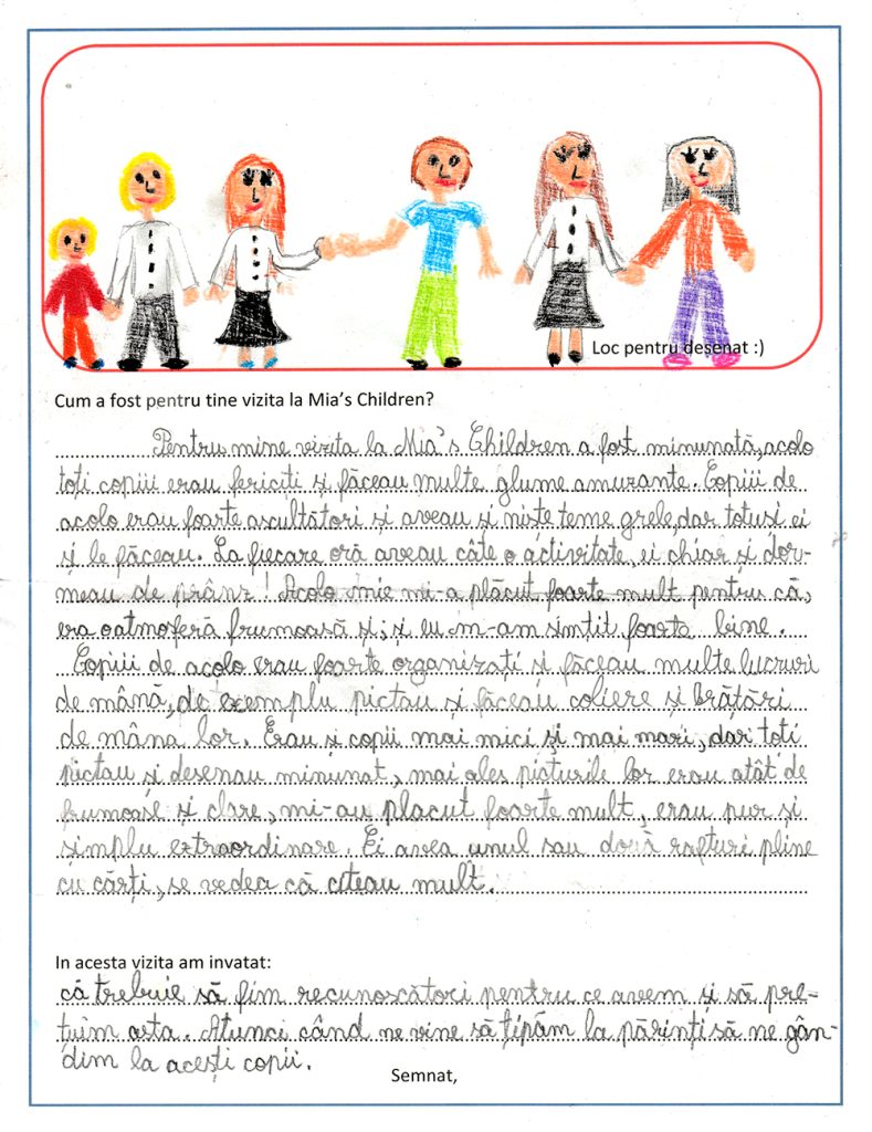 Ne-am propus ca din banii strânși la târg să fie cumpărate rechizite, materiale pentru artă, lucru manual și alimente. Să colectăm pentru ei produse de igienă corporală și cărți… cât mai multe cărți. Iar o parte din ceea ce ne-am propus s-a și împlinit cu ajutorul copiilor și părinților Echilibria. În fiecare săptămâna, câte un grup de 6 copii ai Clasei Ginger merge la cumpărături, după care îi vizitează pe copiii de la Mia’s Children pentru câteva ore. Sunt momente frumoase de socializare, povestesc despre școlile lor, despre talentele pe care le au, își arată unii altora la ce sunt buni și povestesc despre activitățile din casa lor. De fiecare dată se despart entuziasmați că s-au cunoscut, că au împărtășit fiecare din frumusețile copilăriei lor. Sunt gesturi mici, poate vizite prea scurte pentru cât ar dori copiii să se joace, însă e o oportunitate de a-și exprimă această tendința umană – de a fi în serviciul altora, de a dărui. Dăruirea este parte din bunătatea înnăscută și dezvoltarea spirituală a copilului la care noi, profesorii, avem onoarea să luăm parte și să le încurajăm. Dacă doriți să cunoașteți îndeaproape proiectul Mia’s Children și rezultatele acestuia puteți accesa website-ul lor www.mias-children.ro Iar dacă aveți curiozitatea de a afla despre acești copii prin ochii și sufletul altui copil, mai jos găsiți un “articol” scris de una dintre fetițele Clasei Ginger (Maria, 9 ani), după vizita sa la Mia’s Children.