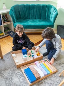Clasele sunt luminoase, cu ferestre largi, iar pereții sunt aerisiți, doar cu picturi originale din diferite perioade ale istoriei. Mobilierul de lemn, într-un amestec de modern și vechi, este ordonat în mod degajat în clasă, iar rafturile sunt pline de materiale care invită copilul să cunoască o varietate de aspecte culturale și educaționale.Înțelegem faptul că nu putem transfera în mod direct cunoștințele în mintea copiilor, în schimb fiecare dintre ei învață prin eforturile personale și în ritmul propriu. Educatorul explică lecțiile, spune povestirile și oferă îndrumări, însă învățarea are loc atunci când copilul studiază singur, probabil în timp ce descoperă operațiile de împărțire cu numere mari folosind materialele corespunzătoare, în timp ce studiază diferențele dintre tipurile de flori sau în timp ce discută cu un coleg motivele pentru care o anume civilizație a luat naștere într-un anumit loc și timp. Prioritatea noastră este aceea de a-i învăța pe copii cum să folosească materialele și cum să atingă un obiectiv, conectându-l pe acesta la mediul pregătit, astfel încât să poată explora materiale educaționale cu o independență din ce în ce mai mare.
